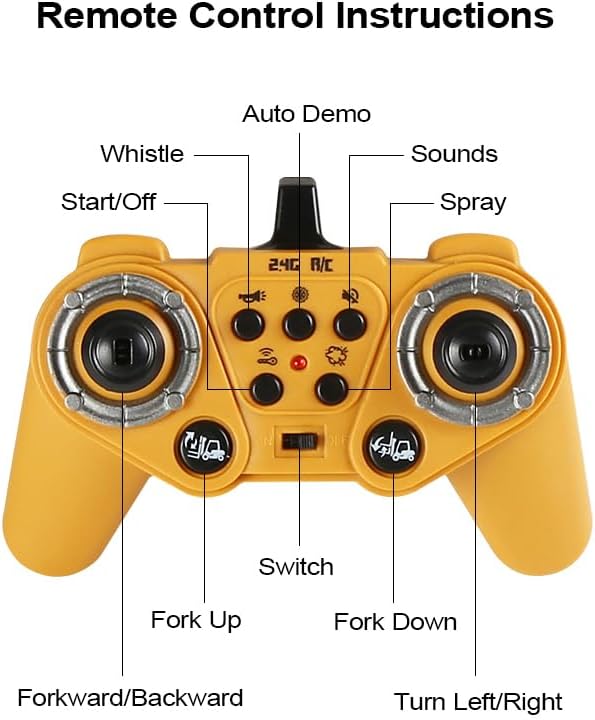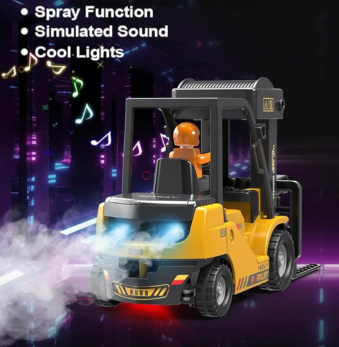- 11 Channel RC Forklift: Forklift can go forward & backward, turn left & right, forklift pallet up & down, simulation sounds & lights, spraying, one key demo.