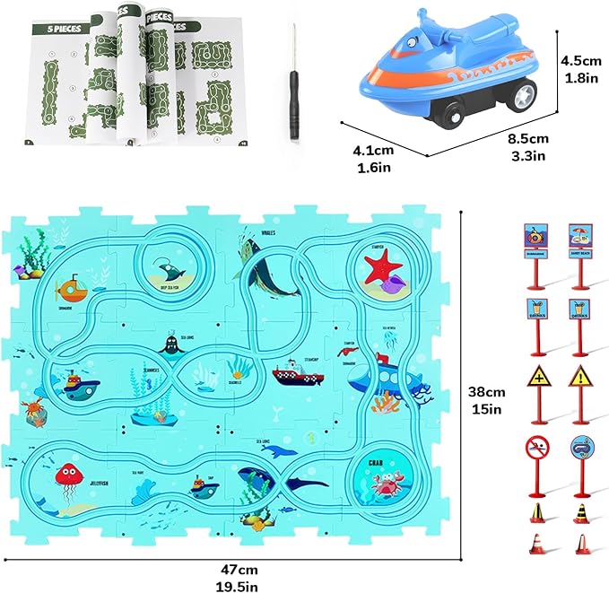 - New Jigsaw Puzzles & Track Car Toys: This puzzle racer kids car track set includes 12 puzzles pieces, 12 road signs, 1 boat shaped vehicle(1 AAA battery required, not included); Kid need to assemble the puzzles pieces to allow the car to follow the track