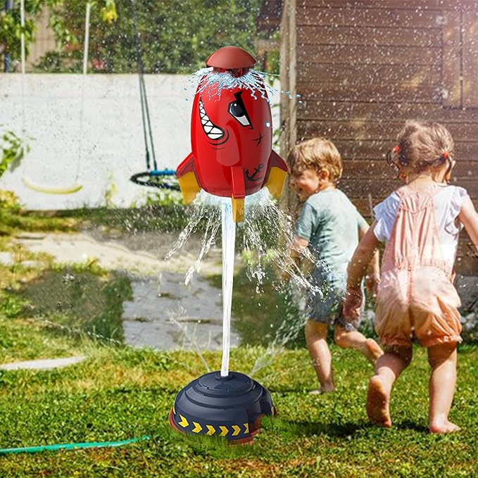 - 【Easy Install and Use】Rocket Launcher Sprinkler Toys for Kids installs without tools.You just need to connect your usual garden hose to the water outlet and the rocket sprinkler head. You can control the water pressure by controlling the switch of the water outlet to make the rocket reach the height you want. Water will spray from the rocket head. Note: Please operate slowly when turning the switch on or off. Flying too high will affect the stability of the rocket.NO recommended to fly too high.