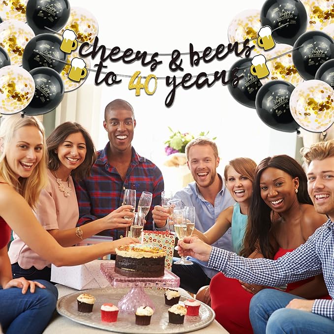 - Decorate Your 40th Party Sparkle: Creative cheer to 40th birthday banner and balloons in simple but gorgeous black & gold theme make your party brilliant and unparalleled. Put on these 40th birthday decorations on the wall, window, garland or garden which appeals to everyone