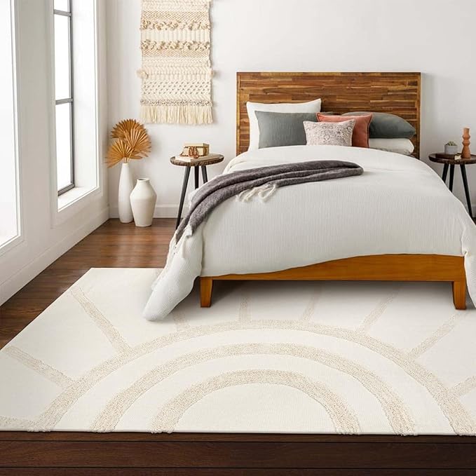 - [Eye-catching Boho Design] Modern-minimalist low-profile rug, the tufts on the rug are designed in the shape of sunrise, which brings a warming, renewed feel to any space. Unique and beautiful designs will make you get a compliment from friends and family.