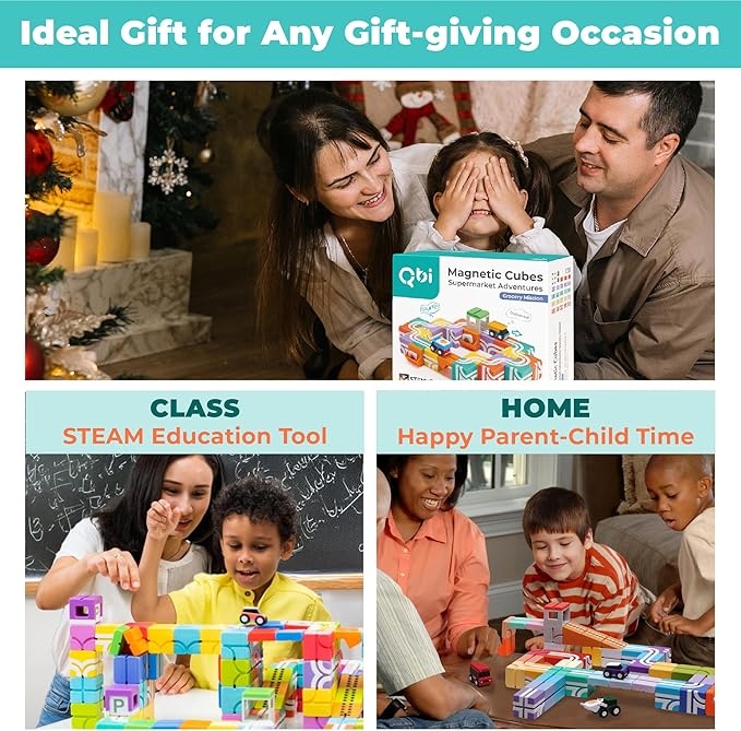 - 【Supermarket Adventures for Creative Toddlers】 Turn everyday play into a learning mission with QBI’s Supermarket Adventures! This 32-piece magnetic toy set lets toddlers build their own market, deliver goods, and learn sequencing and role-play. The colorful fruit tiles and pull-back cargo trucks add movement, making playtime both dynamic and educational.