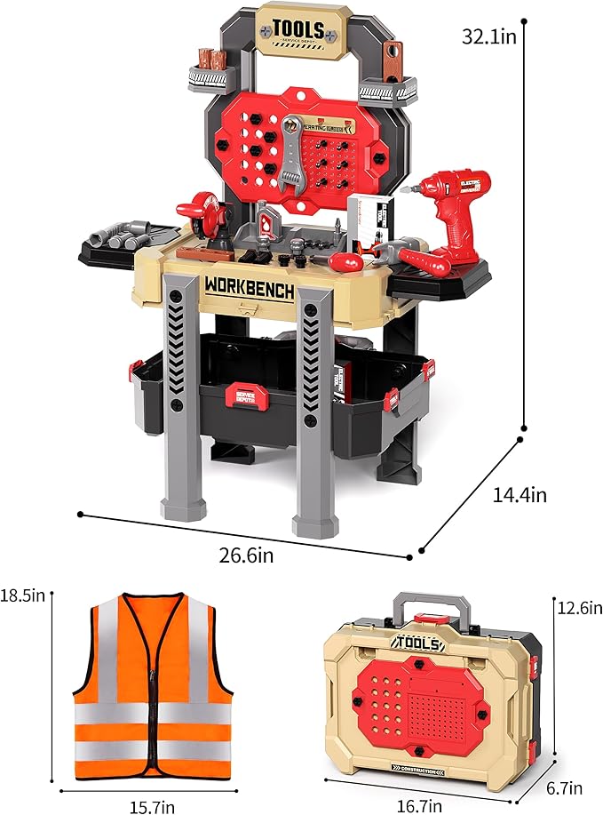 • 【Develop your child's skills】 Well-built kids tool set features high-quality materials and a steady structure, making it safe for kids to entertain for a long time. The tray underneath the kids workbench is large and deep enough to hold all pieces. The table top of the toy workbench is great for pretending to cut or drill, giving kids' imagination a boost.