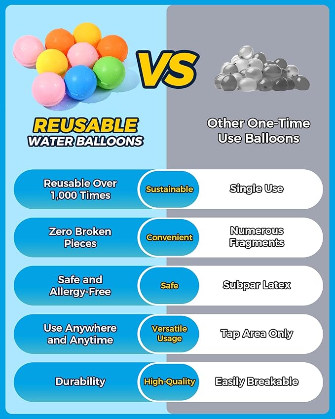 - 【Safe and Secure】 -- Our water balloons reusable are made of a non-toxic, latex-free soft silicone material. Safe for both children and adults. When fighting in the water, don't worry about getting hurt. Say goodbye to latex allergies and safety issues and enjoy the joy of our water balloons.