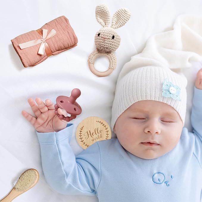 - [Gift Box for Parents]: Montessori gift sets include a baby blanket, baby brush, baby teether, handmade rattle, wooden milestone cards, drool towel, pacifier bag. These can completely meet the needs of the baby from birth to toddler.