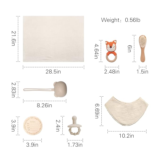 - [Size]: The size of the baby blanket is 21.6 inch x 28.5 inch.It's appropriate to wrap a newborn baby.Teether size is 1.73 x 2.4inch.Baby brush size is 1.5 x 6inch.Drool towel size is 8.7x7inch. Wooden cards size is 3.9x3.9inch.Pacifier bag size is 8.26x2.8inch.Rattle size is 2.2x5.9inch.