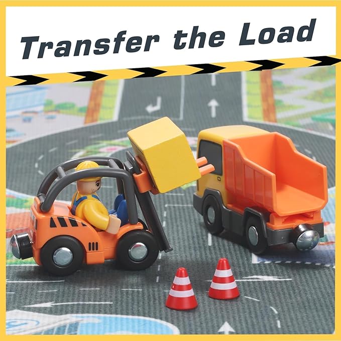 - đăMultiple Game Themesă can be combined into different play themes including logging, mining and city transportation scenes. The forklift, crane truck and dump trucks all contain highly playable functional parts and can be interact with train carriages. The set sparks childrn's imagination,encourage hands-on play and facilitate development of fine motor skills.