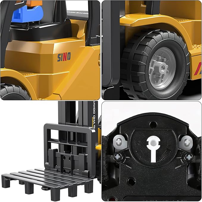 - 【11-channel Forklift】RC forklift truck has eleven different functions, rc crane can be forward/backward, left/right, can move the forklift to push the box to move . The fork on the front of the cart can be moved up and down.The car also has authentic forklift sounds, lighted music features.The car runs and behaves like a realistic bulldozer.