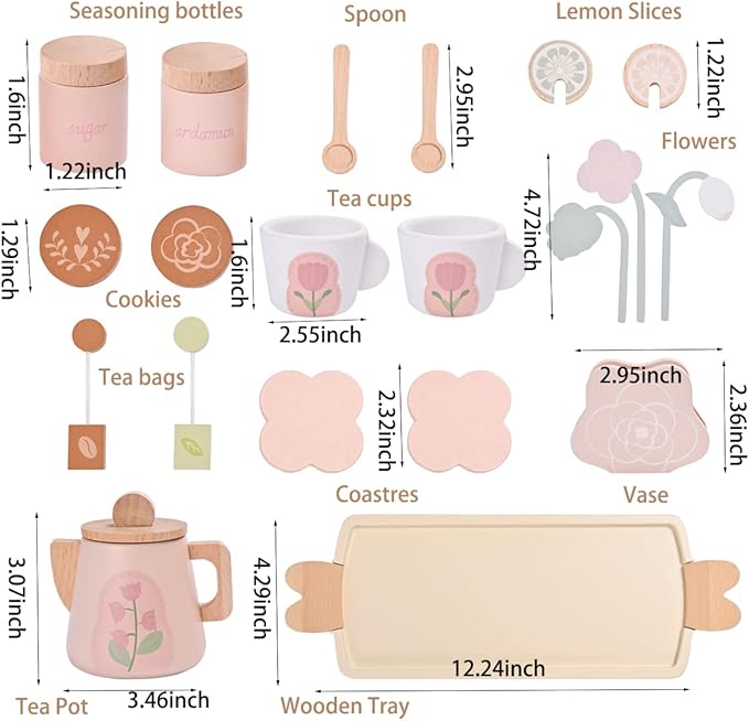 - 【Quality Food Set】18 piece play accessories in all! MONT PLEASANT wooden toys tea set comes complete with everything you need for a little tea party. Including a pretty Tray, a Tea Pot with removable lid, a wooden vase, Artificial paper flowers, 2 cups, 2 saucers, 2 spoons, 2 seasoning bottles, 2 cookies, 2 wooden tea bag, 2 lemon slice.