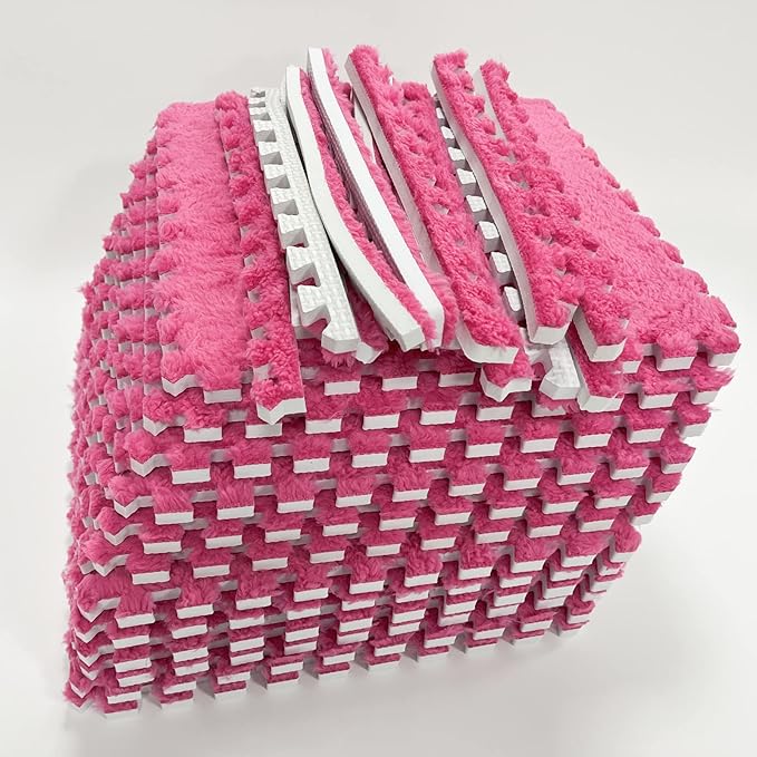 Interlocking Carpet Shaggy Soft EVA Foam Mats Fluffy Area Rugs Protective Floor Tiles Exercise Play Mat for Children Kids Room Home Parlor Bedroom (12 Pcs, Rose)