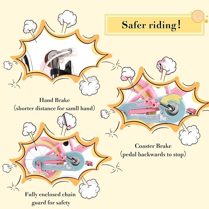 - 【Reliable Features】 Double brakes (front-hand caliper brake plus coaster brake) provide ample braking power. The enclosed chain guard prevents your child from touching the chain. Thick tires provide better ground grip. Rully Kids bike allows children to ride safely.