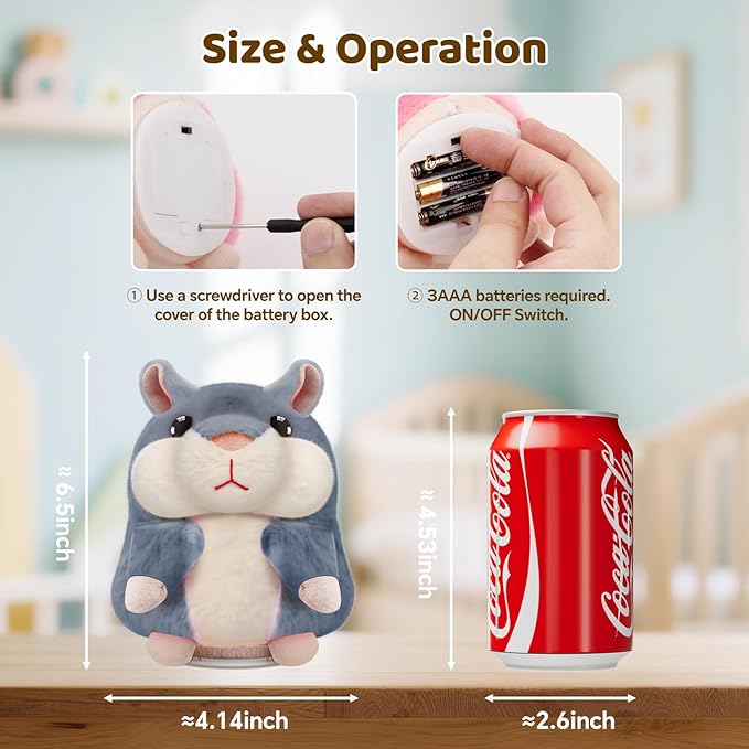 - Kindly Note, the detail size of talking hamster toys is height-6.5 inch(16.5CM).