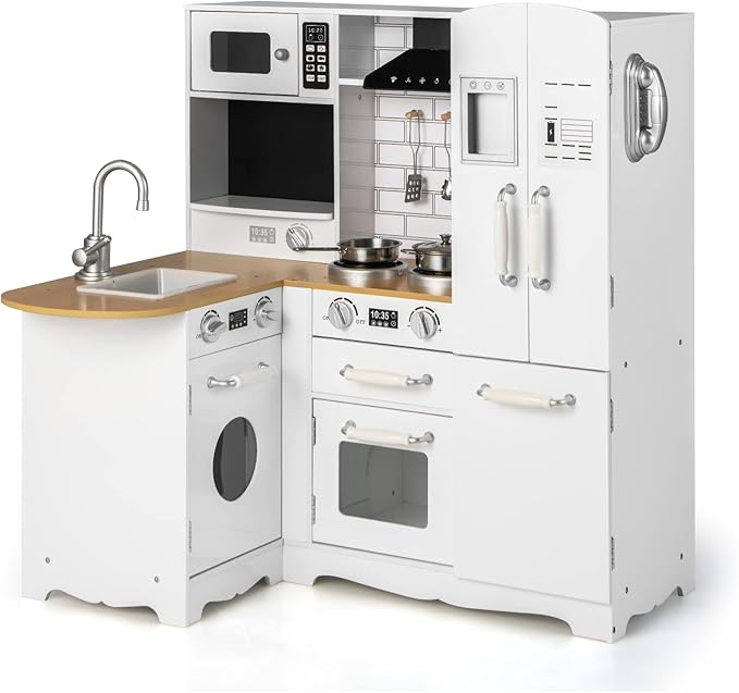 - 【Lots of Playable Features】This HONEY JOY kids corner kitchen playset comes with a washing machine, range hood, stove, oven, microwave, water dispenser, side refrigerator, sink & faucet, induction cooker and a telephone, which enrich kids play hours and gives kids realistic experience. Kids can freely interact with these realistic cooking accessories and furniture!