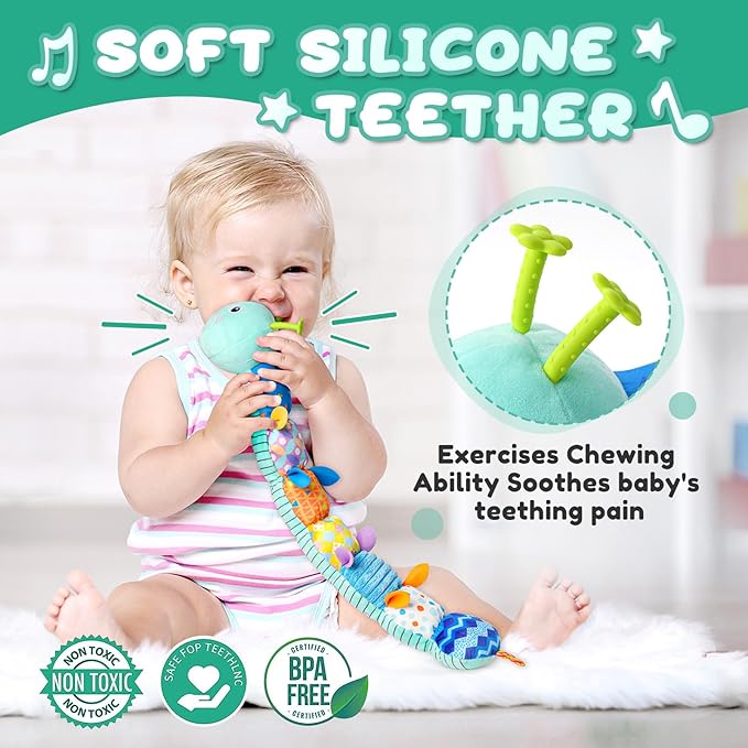 - Sensory Learning Toys - The body part of the baby caterpillar toy has 3 different sensory designs - crinkle, rattle and bell. Each has a different texture and sound. Baby's eyes and hands will focus on these design as they explore. It helps baby develop fine motor skills and auditory development.