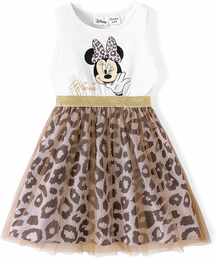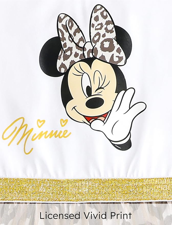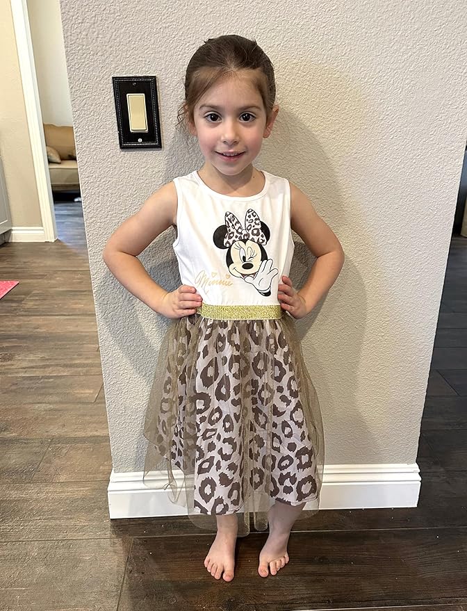 - Charming Design: This sleeveless dress features a loose fit for comfort and practicality. The design showcases Minnie Mouse with a chic leopard-print bow, paired with a golden glitter waistband and a stylish leopard-print tulle skirt for a trendy, playful look. With its fit-and-flare silhouette and breathable fabric, it ensures all-day comfort for little girls