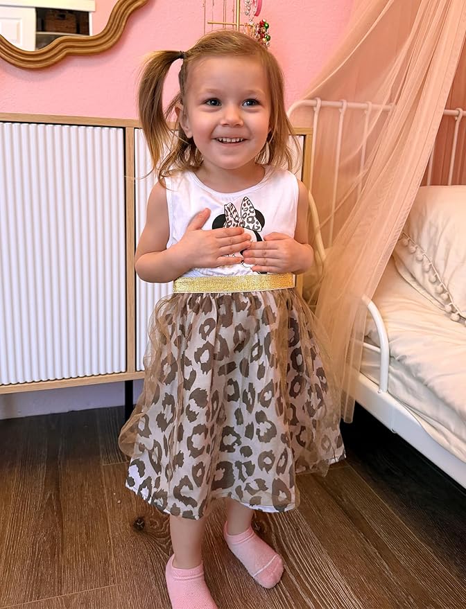 • Charming Design: This sleeveless dress features a loose fit for comfort and practicality. The design showcases Minnie Mouse with a chic leopard-print bow, paired with a golden glitter waistband and a stylish leopard-print tulle skirt for a trendy, playful look. With its fit-and-flare silhouette and breathable fabric, it ensures all-day comfort for little girls