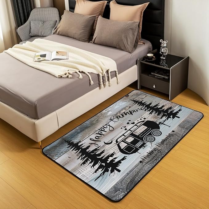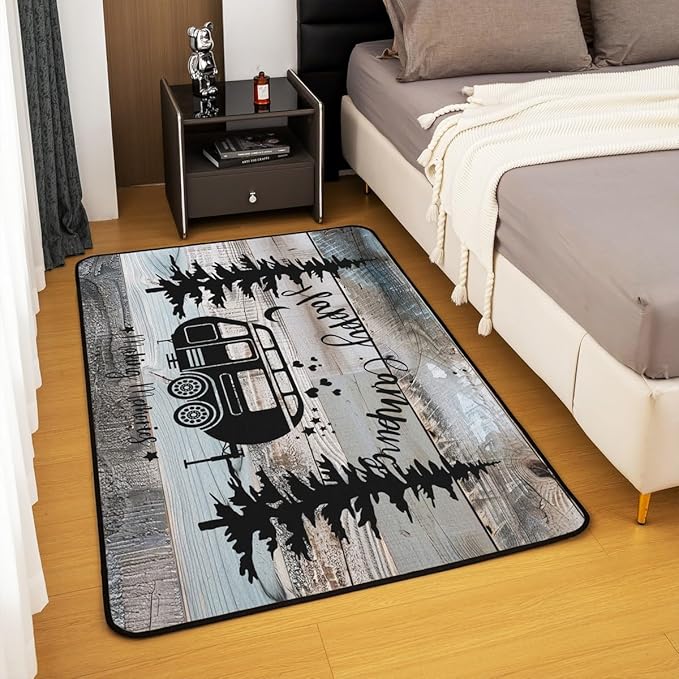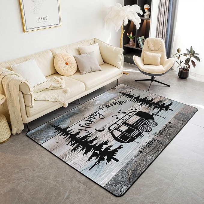 Erosebridal Rustic Farmhouse Style Area Rugs 5x7, Happy Camping Rug for Bedside Camper Carprt for Boys Kids Teens, Black Sketch Drawing Vintage Old Barn Accent Rug