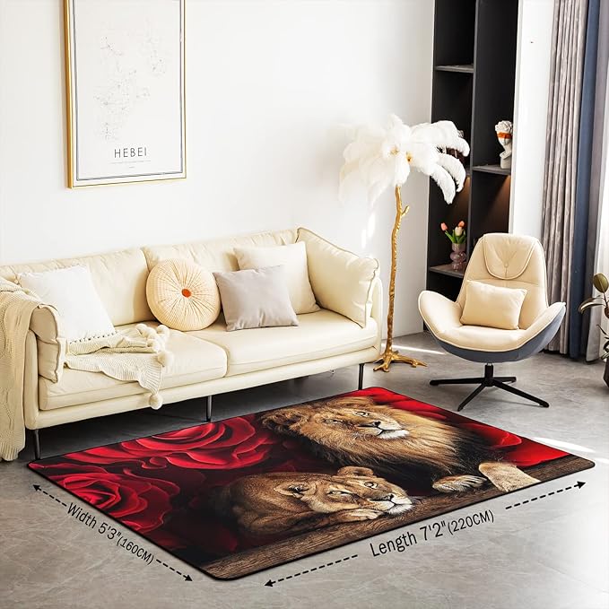 Erosebridal Rose Flower Area Rug 5x7, Animal Lion Print Rug for Kids Teen Boys Girls, Floral Non Shedding Carpet for Bedroom, Modern Style Living Room Rugs