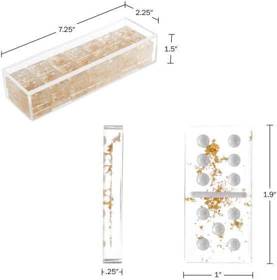 - PRODUCT DETAILS - Materials: Acrylic. Dimensions: Individual Domino - (L) 1.9” x (W) 1” x (H) 0.25”; Case - (L) 7.25” x (W) 2.25” x (H) 1.5”. 28-Piece Dominos Set with Clear Acrylic Display Case. Color: Gold Foil.