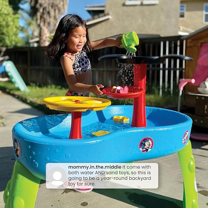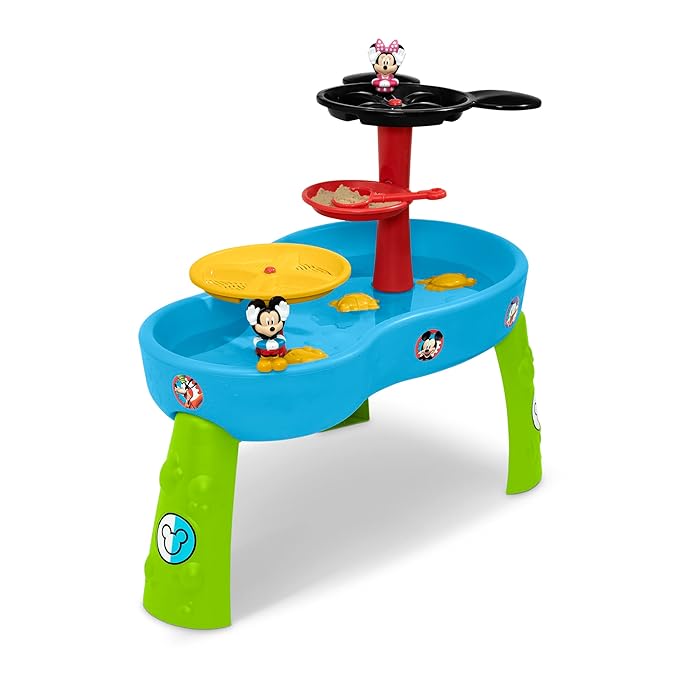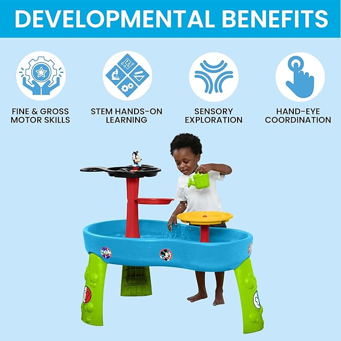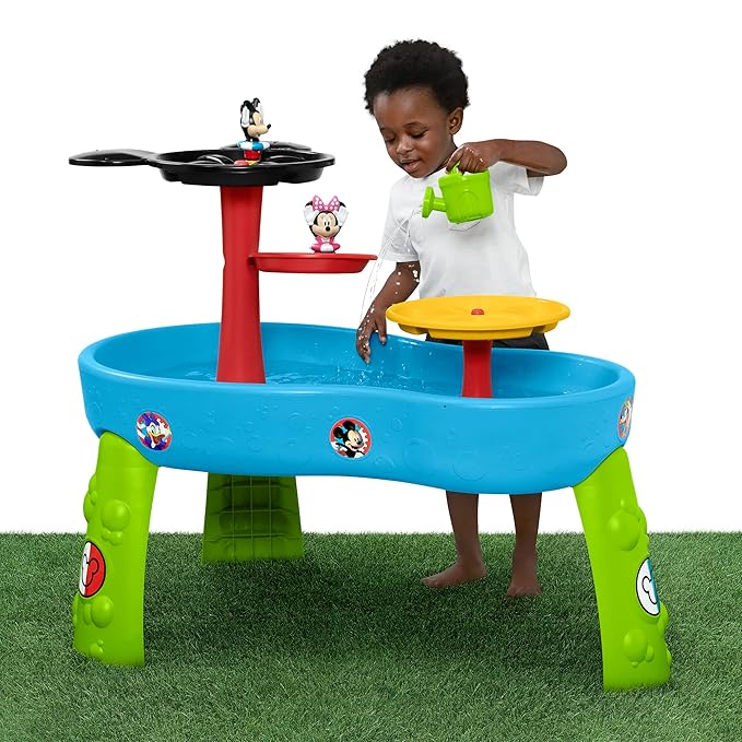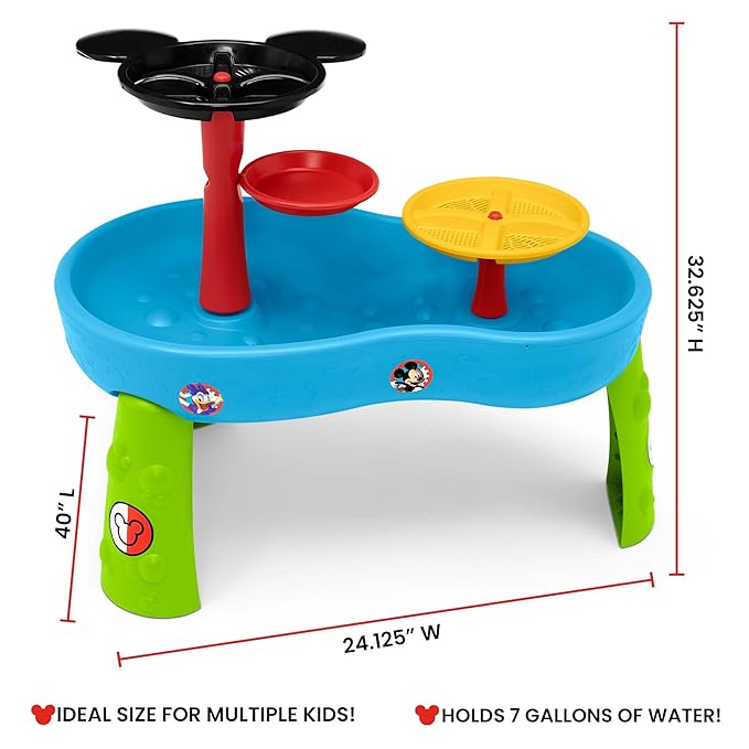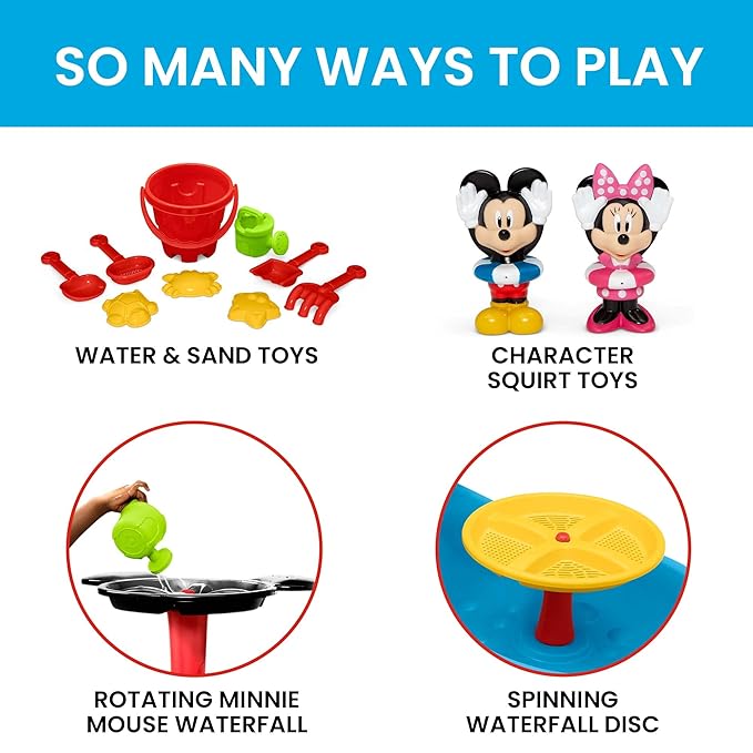 - FOR MICKEY MOUSE FANS: Kids will be amazed by the rotating Mickey Mouse waterfall feature and spinning waterfall discs | Colorful weather-resistant Mickey Mouse stickers decorate the water table