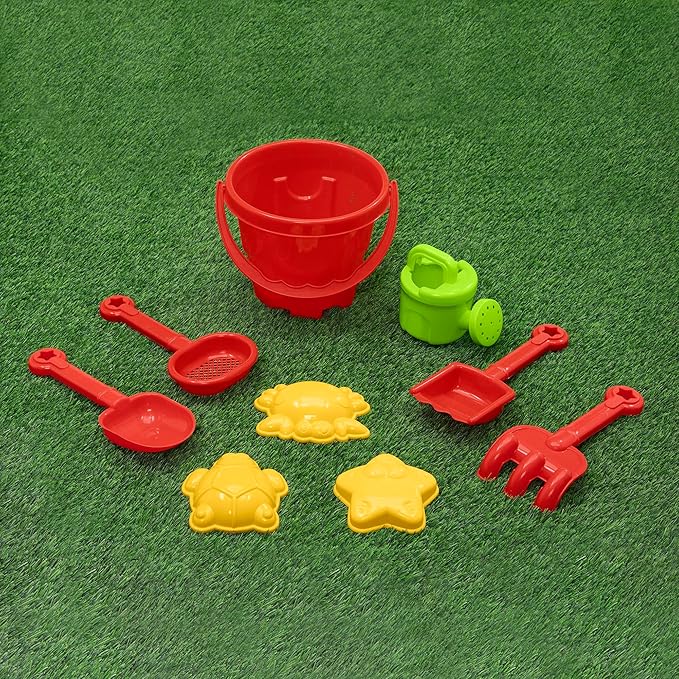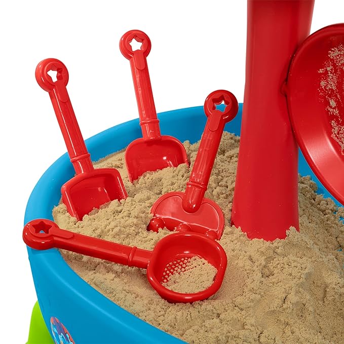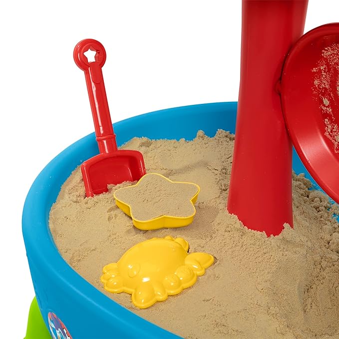 - WHAT’S INCLUDED: 11 sand and water toys are included with this table | Set includes a bucket, watering can, 2 shovels, 2 scoopers, 3 sand molds and 2 character toys that can also be used as squirt toys