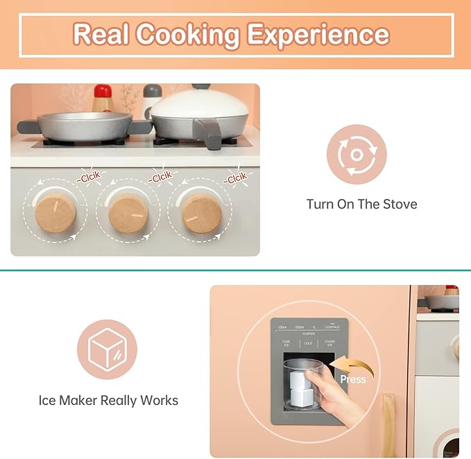 - 【Plenty of Play Features】Wooden play kitchen is equipped with an freeze ice maker, microwave, stove, faucet, sink, washing and dryer machine . It also comes with a clock, oven, cookware set, spatula and ladle, pot with lid and skillet, farm food accessories, pizza, hamburger, swiss roll, cakes. Rich configuration can enhance 3+ ages children's coordination and imagination