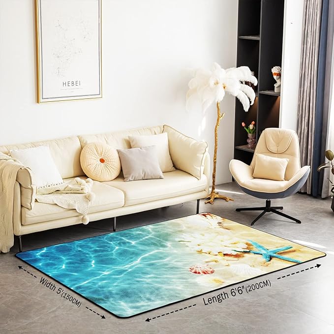 Ocean Area Rugs 5x6'6'', Beach Rug, Coastal Nature Theme Teal Carpet, Boys Girls Hawaiian Sea Wave Animals Shell Starfish Washable Accent Rug for Bedroom, Blue