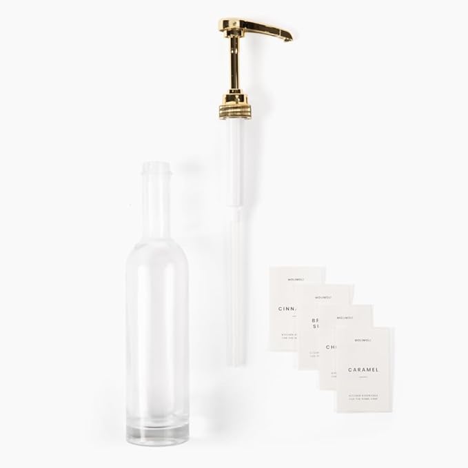 - Molimoli Syrup Dispenser Set: Each Set includes two custom-made high quality coffee syrup bottles, two PVC industry-style pumps, a funnel and a prefixed label set.