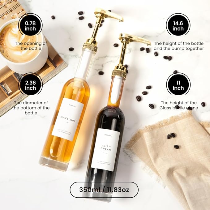 Molimoli Coffee Syrup Dispenser for Coffee Bar, 350mlCoffee Pump Dispenser, Glass Syrup Bottle w. Pumps, Simple Syrup Dispenser w. Labels,Set of 4, (Gold)