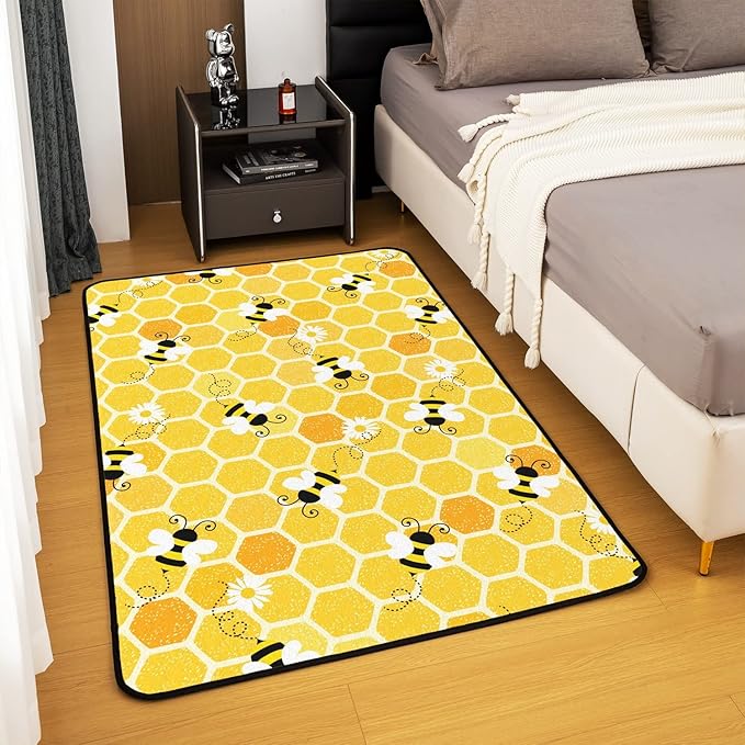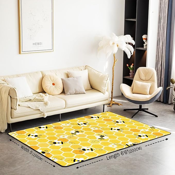 Erosebridal Honeycomb Area Rug 5x7, Bee Flowers Rug for Kids Child Girls, Flying Wildlife Geometry Carpet for Classroom, Hexagon Beehive Rustic Floral Simplistic Geometrical Washable Living Room Rugs