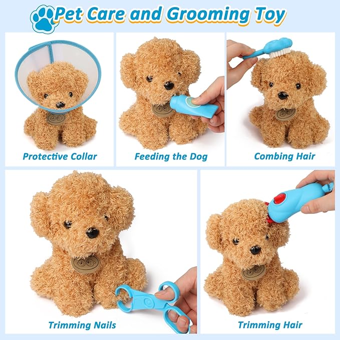 - ABUNDANT DOCTOR TOYS: Our vet play set comes with storage bag, doctor costume, doctor hat, dog toy, pet comb, forceps, glasses, stethoscope, protective collar, pill bottles×2, dental mirror, otoscope, flashlight, thermometer, nutrition ointment, hair clipper, syringe, stickers×10