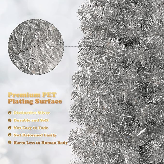 - 【Elegant & Charming Tree Appearance】 Since its charming sliver color, the unlit slim Christmas tree bring home elegant addition for preparing the coming festival. The dense leaves make the tree more real and pure, giving you a feeling of winter season.
