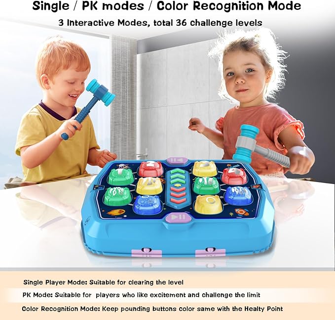 - Toddler Game Interactive Toy: This toddler toy has 3 game modes (Single player mode, PK mode, Color recognition mode), 4 kinds of difficulty modes and total 36 challenge levels that brings more chanllenge and fun for kids. Also can be as a party game between adults.