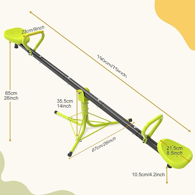 - Sturdy heavy-duty construction and weather resistance: Our seesaw is made with high-quality materials and designed with an ergonomic structure. It is built with reinforced steel tubes that are both heavy and thick, ensuring its durability. It can withstand vigorous play and frequent use without deforming, thanks to its powder-coated reinforcement, guaranteeing years of reliable enjoyment.