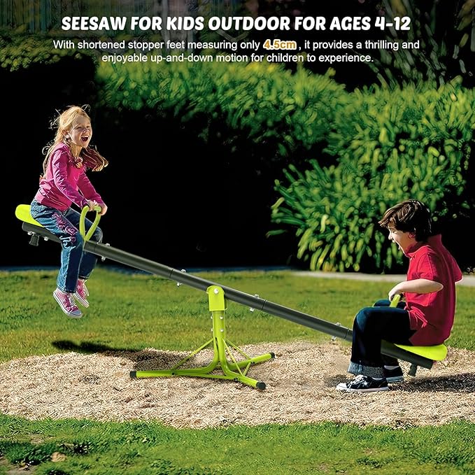 - 360-degree rotating for endless fun: With our seesaw, children can not only bounce up and down but also enjoy spinning around, adding a whole new level of excitement and laughter to outdoor playgrounds.