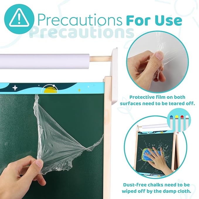 - 【Safety Material】The kids easel is made of high-quality pine wood, ensuring stability and durability, and can withstand years of play. Smooth wood without burrs and rounded corners are safe for infants. There is a fixed accessory on each side of the easel to increase its stability.