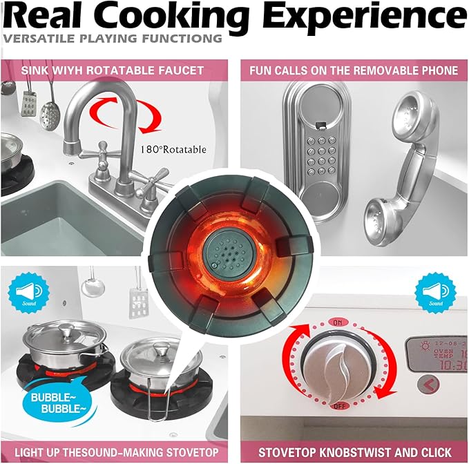 - Multiple Accessories: The set includes chalkboard, cordless phone, realistic water dispenser, battery-powered stove, turntable faucet, microwave, rotatable oven knobs, etc. Your child can get an immersive experience with fun features like the realistic sounds âgulu guluâ and âsizzle sizzleâ which provide additional realism.