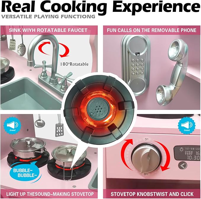 - Multiple Accessories: The set includes chalkboard, cordless phone, realistic water dispenser, battery-powered stove, turntable faucet, microwave, rotatable oven knobs, etc. Your child can get an immersive experience with fun features like the realistic sounds “gulu gulu” and “sizzle sizzle” which provide additional realism.