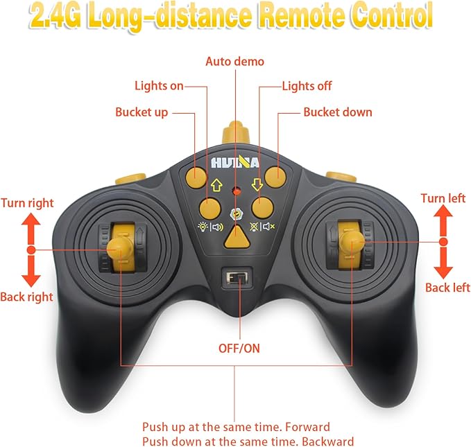 - [Full Functional 9 Channels] -- Remote control front loader is with full functional 9 channels, it can go forward / backward, turn left / right, alloy shovel up / down, simulation light and auto demo function.You can precisely control the vehicle's movement and functions through the remote control and enjoy more control fun.