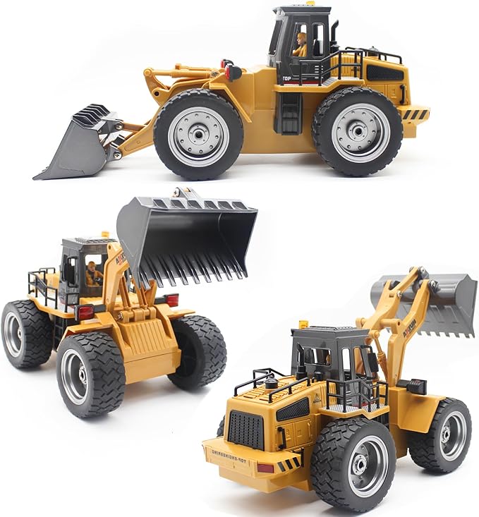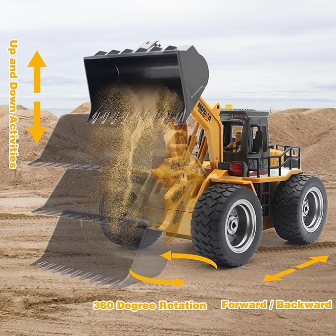 - [ Alloy Shovel Loader ] -- The bulldozer features a robust alloy driver's cabin and alloy bucket loader, ensuring long-lasting durability for rugged usage.The large-gear rubber tires with steering hub provide a firm grip on uneven surfaces, enhancing stability between tires to tackle rugged obstacles.