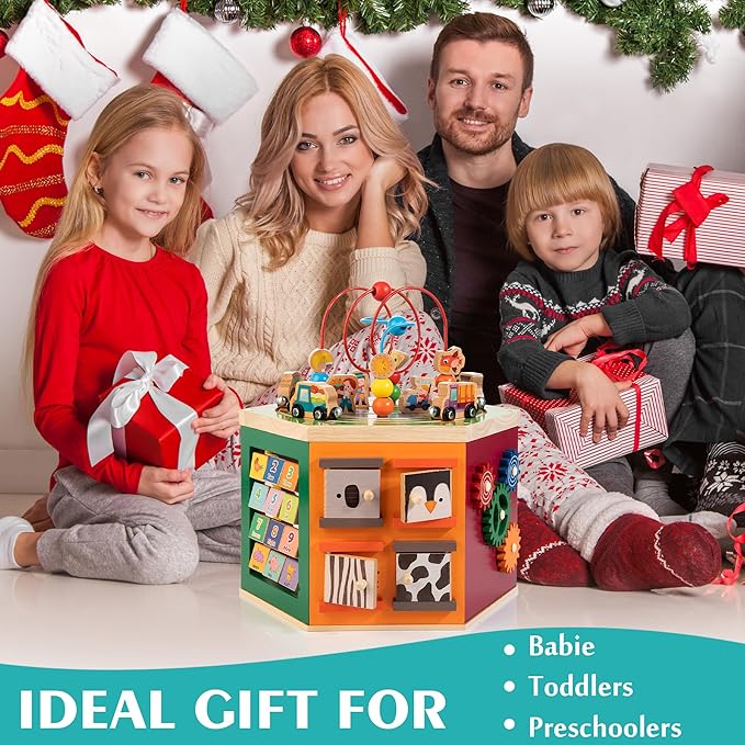 - 【MULTIPLE GAMES, HOURS OF FUN】This wooden activity cube offers 9 engaging games in one - shape match, abacus, zigzag paths, flip and learn farmyard, peek-a-boo farm animals, spin the gears, bead maze, work on the farm, magnetic trains drive along the track. Keep your little one entertained for hours with this versatile playtime companion