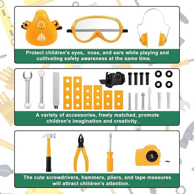 - 【Educational Pretend Tool Toys】They encourage imagination and pretending that will not only be lots of fun for your child but also have a really positive impact on healthy development. It helps to build important connections in your child’s brain as well as helps prepare them for using things like real tools as they get older.