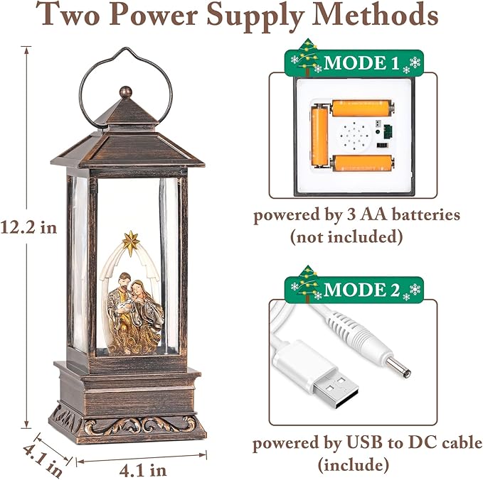 - USB Plug-in & Battery Operated: Each Nativity Christmas snow globe lantern with music requires 3 AA batteries(Not Included) or USB to DC cable(Included) to operate, over 60 hours long lasting live with batteries.