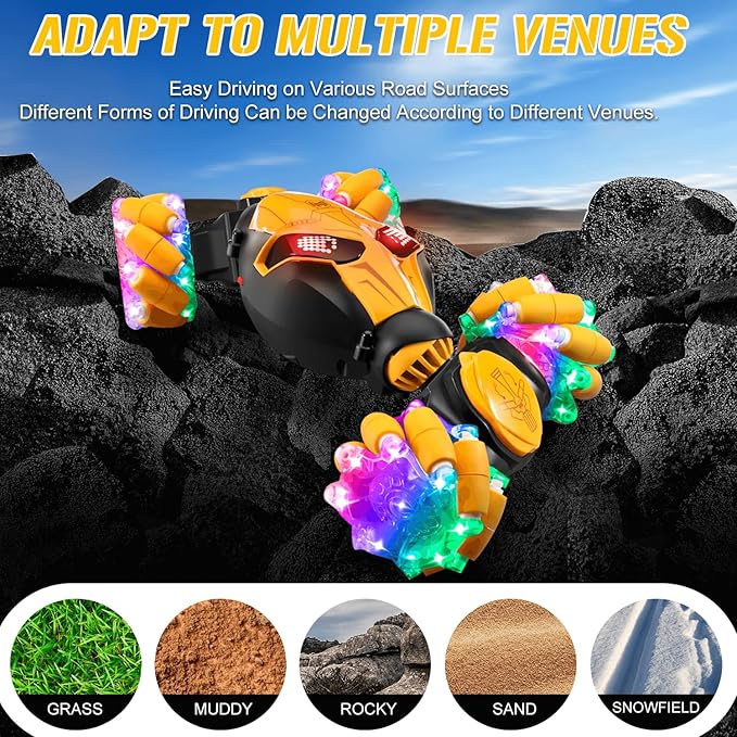 - All-terrain driving&Gesture Sensing RC Stunt Car:The rc stunt car gesture sensing is made of durable ABS plastic and high-quality metal, equipped with unique roller traction tires. Those hand controlled rc car increased impact resistance, shock and shatterproof, equipped with powerful motor, perfect for grassland, sandy, rugged mountain roads, etc. and easily overcomes various obstacles.