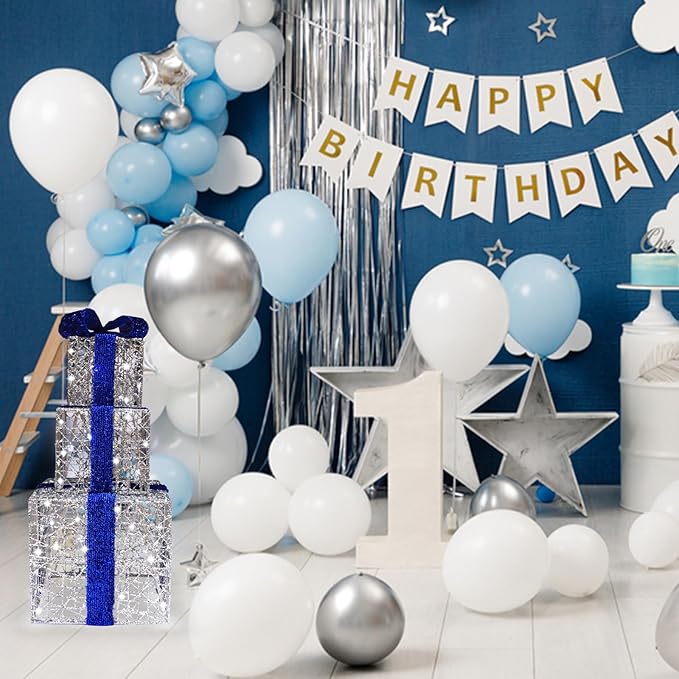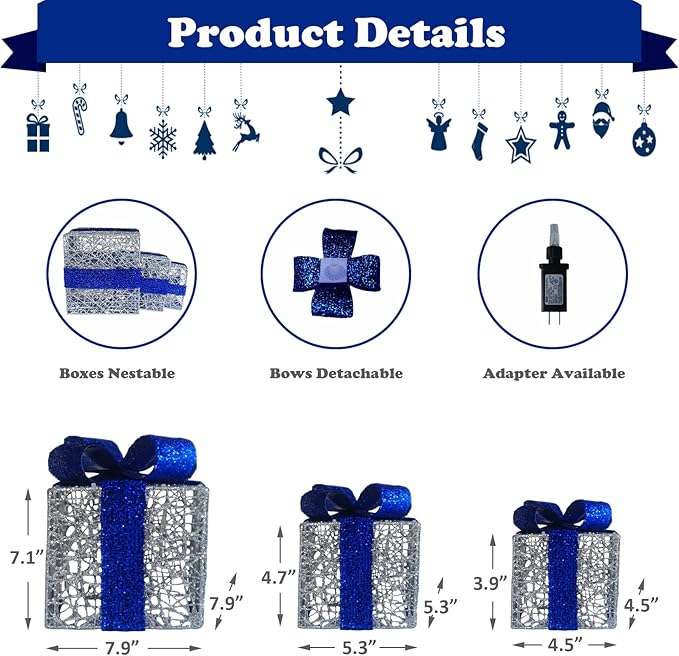 - 【Versatile Decorations】The minimalist designed lighted blue gift boxes decorations, matching your various styles decor like white themed, red themed, rustic style or natural woodland decor, can be placed on tree skirt under the Christmas tree in your living room, porch or front yard. Beyond its holiday appeal, our outdoor sparkling gift box can also be art decoration for birthdays, anniversaries, weddings or parties. Its timeless charm makes it a perfect decoration throughout the year.