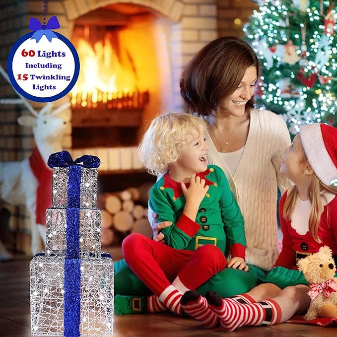 Lighted Gift Boxes Set of 3, Silver Boxes with Bow, Prelit 60 White Lights Present Box Lighted Display with Plug for Home Porch Outdoor Yard Christmas Decorations-Blue