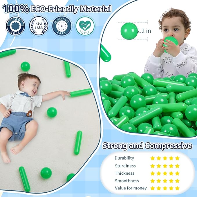 - 🤍Pack of 120 pcs toy Balls with green colors., Made of food grade PE material with phthalate free, BPA free, lead free and non-PVC plastic, non-toxic, no smell. Each pit ball is thickened, more durable, and more brightly colored.. CPSC Test Report recommended Age:0+