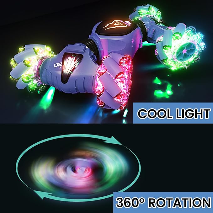 - Gesture Sensing RC Stunt Car: Equipped with a 2.4GHz remote and a gesture sensing watch; just wear the watch to control the car’s movements, making the remote control experience more fun and interactive.