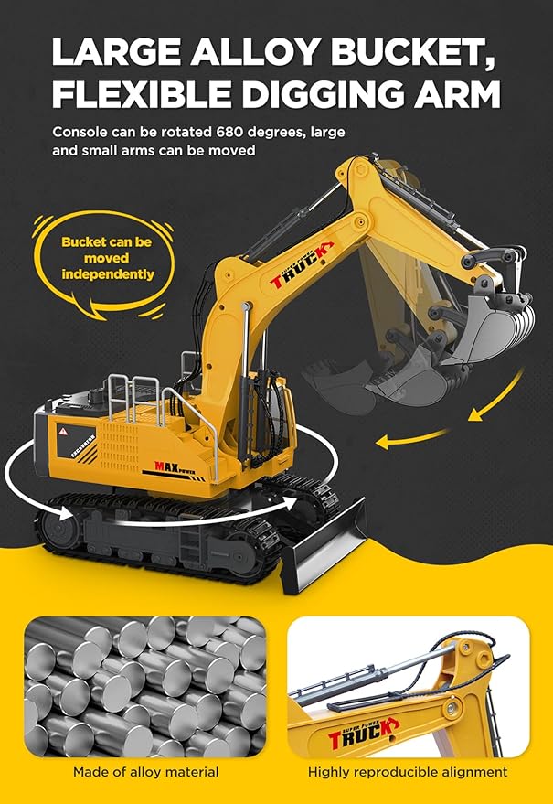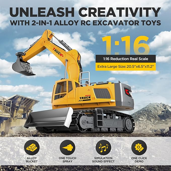 - 15-Channel Realism and Detail: Command the 15-Channel Remote Control Excavator Toy with awe-inspiring realism. The solid metal bucket and Dozer blade, lifelike 1:16 scale, 20.5" x 6.5" x 11.2" Extra Large Size, spray function, and authentic tank track design guarantee an immersive play experience. Every detail is carefully crafted to immerse you in the world of construction