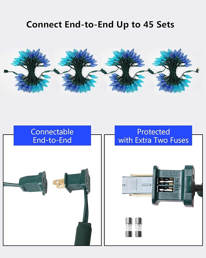 - 【End to End Connectable】Simply, plug in and go! you can connect up to 45 sets together, and connect easily to your previous lights, end-to-end up to a maximum 216Watts(1.8Amps) total. It can meet your desired length and make your decoration more convenient. Each set comes with 2 extra replacement fuses.